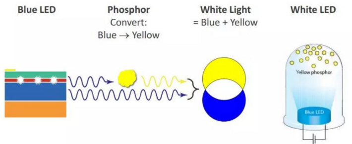 而归根结底,造不出白色的 LED,是因为当时人们无法生产蓝色的 LED。要产生白光,有两种方案,一种是蓝色与黄色的组合,另外一种是红色、绿色与蓝色的组合。无论怎么样,这都需要用到蓝光 LED。