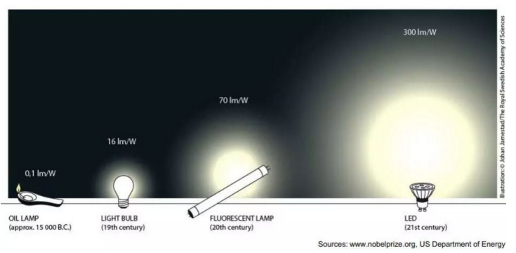 为什么 LED 那么省电呢?因为 LED 是冷光源,它不会产生红外线与紫外线这种对照明无用的损耗。另一方面,LED 灯的寿命极长,至少可以到达上百万小时,也就是说一盏 LED 灯可以用 392 年。所以,无论从节能还是从使用寿命来说,LED 灯的市场前景被极度看好。