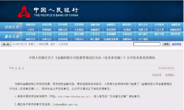 7月26日傍晚,央行干了一件大事:酝酿已久的《金融控股公司监督管理试行办法》公布,并征求意见。