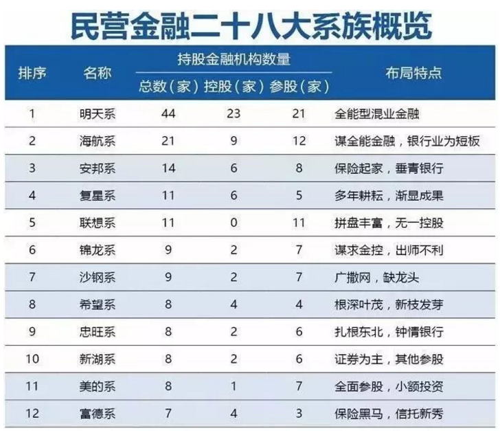曾有媒体在2018年的时候,整理了一份“民营金融28大系”(见下图),大家可以看一下。当然,经过治理整顿,目前的情况已经发生了很大变化。