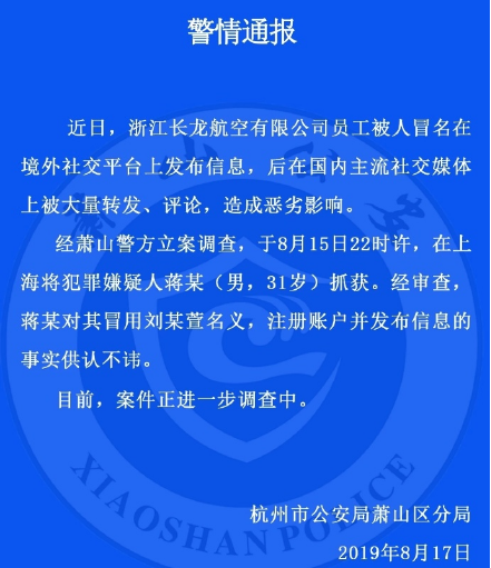 通报称,近日,浙江长龙航空有限公司员工被人冒名在境外社交平台上发布信息,后在国内主流社交媒体上被大量转发、评论,造成恶劣影响。经萧山警方立案调查,于8月15日22时许,在上海将31岁的男性犯罪嫌疑人蒋某抓获。