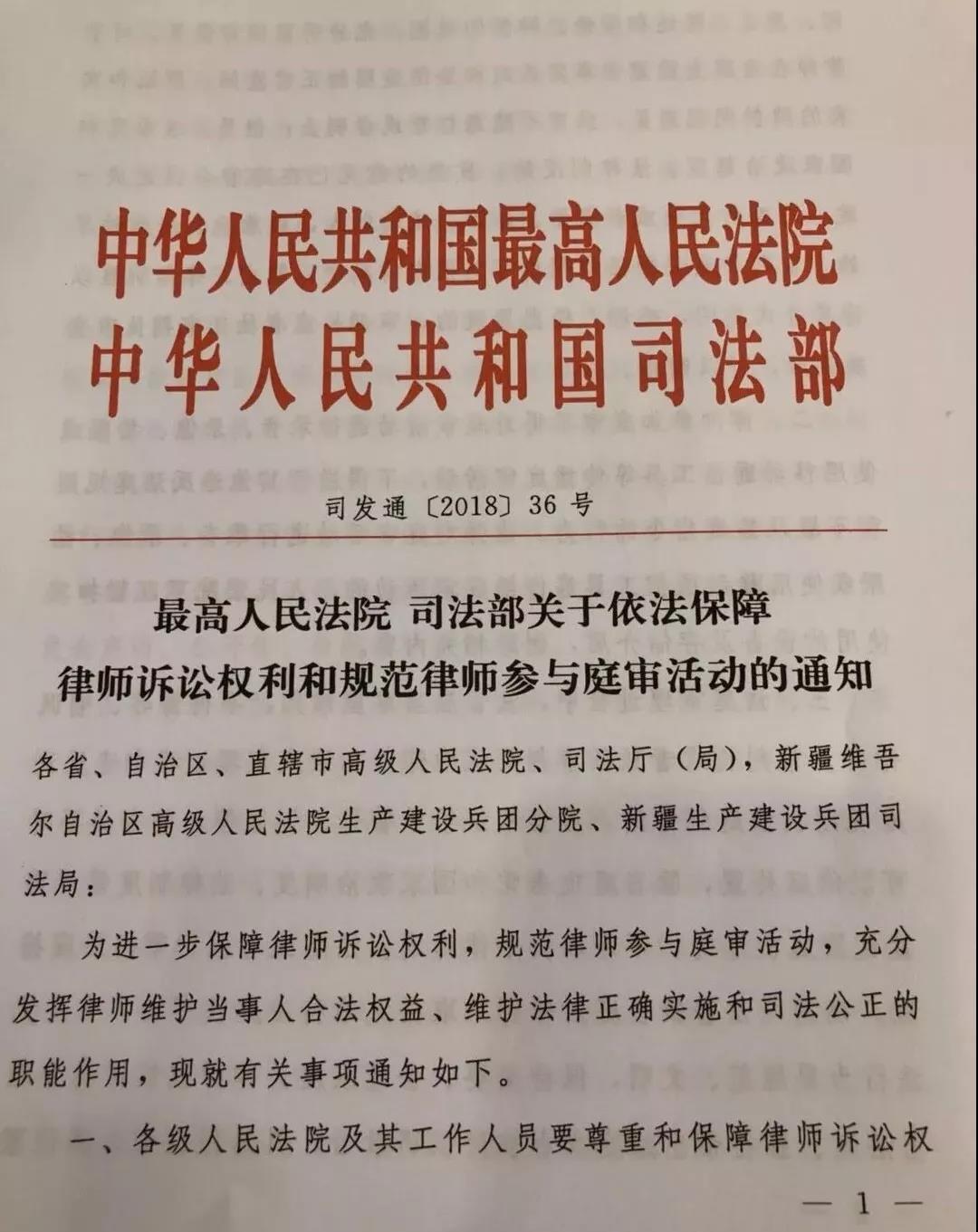 最高人民法院、司法部联合印发了《关于依法保障律师诉讼权利和规范律师参与庭审活动的通知》。《通知》是专门针对庭审环节律师权利保障和行为规范的第一个规范性文件,保障律师权利是该通知的重点内容。