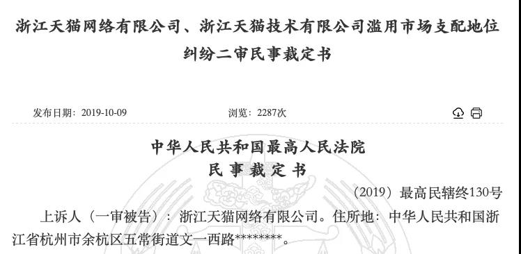 近日,中国裁判文书网发布的一则裁定书,让京东起诉天猫滥用市场支配地位一案的管辖权异议问题有了结果。
