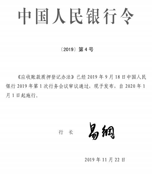 为进一步规范应收账款质押登记,保护质押当事人和利害关系人的合法权益,根据《中华人民共和国物权法》等相关法律规定,中国人民银行发布了修订后的《应收账款质押登记办法》,自2020年1月1日起施行。原《应收账款质押登记办法》(中国人民银行令〔2017〕第3号发布)同时废止。