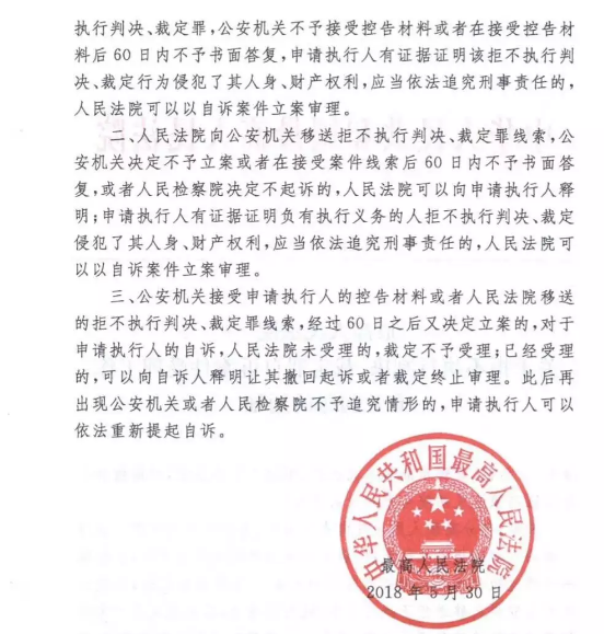 一、申请执行人向公安机关控告负有执行义务的人涉嫌拒不执行判决、裁定罪,公安机关不予接受控告材料或者在接受控告材料后60日内不予书面答复,申请执行人有证据证明该拒不执行判决、裁定行为侵犯了其人身、财产权利,应当依法追究刑事责任的,人民法院可以以自诉案件立案审理。