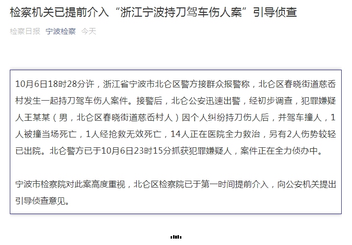中新网10月7日电 据宁波市人民检察院微信公众号消息,10月6日,浙江宁波发生一起持刀驾车伤人案。宁波市检察院对此案高度重视,北仑区检察院已于第一时间提前介入,向公安机关提出引导侦查意见。
