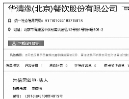 据某企业信息查询平台显示,华清缘(北京)餐饮股份有限公司于2015年2月15日被京海食药监处行政处罚,罚款5000元并没收违法所得24元。2017年12月28日,该企业因通过登记的住所或者经营场所无法联系,被北京市工商行政管理局海淀分局列为经营异常。