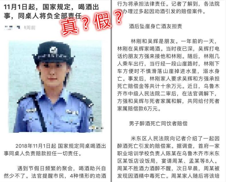 把最近网传的这篇《11月1日国家规定喝酒出事同桌人负全部责任》与普法文章《【以案释法】劝酒出事四种情况要担责》对比,全文几乎一样,除了这两点:第一,最近网传的文章在开头多了一句“2018年11月1日起,国家规定同桌喝酒出事同桌人负责赔款担任一切责任”;第二,网传文章删除了原文第一段中的几个法院的名字。这就说明,4年前的一篇普法文章被人篡改抄袭了。