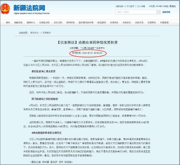 经调查,该文是被反复转载了几次的“二手文章”,2014年起网上就出现了内容类似的文章。当时,文章文末还标有“转自新疆法院网”的字眼,转载了几次后就被人删除了。在2014年5月7日,新疆法院网发布过《【以案释法】劝酒出事四种情况要担责》一文。可以看出,这篇文章较大可能是新疆当地的都市报在当月发布的一篇新闻,同时也是一篇普法文章。